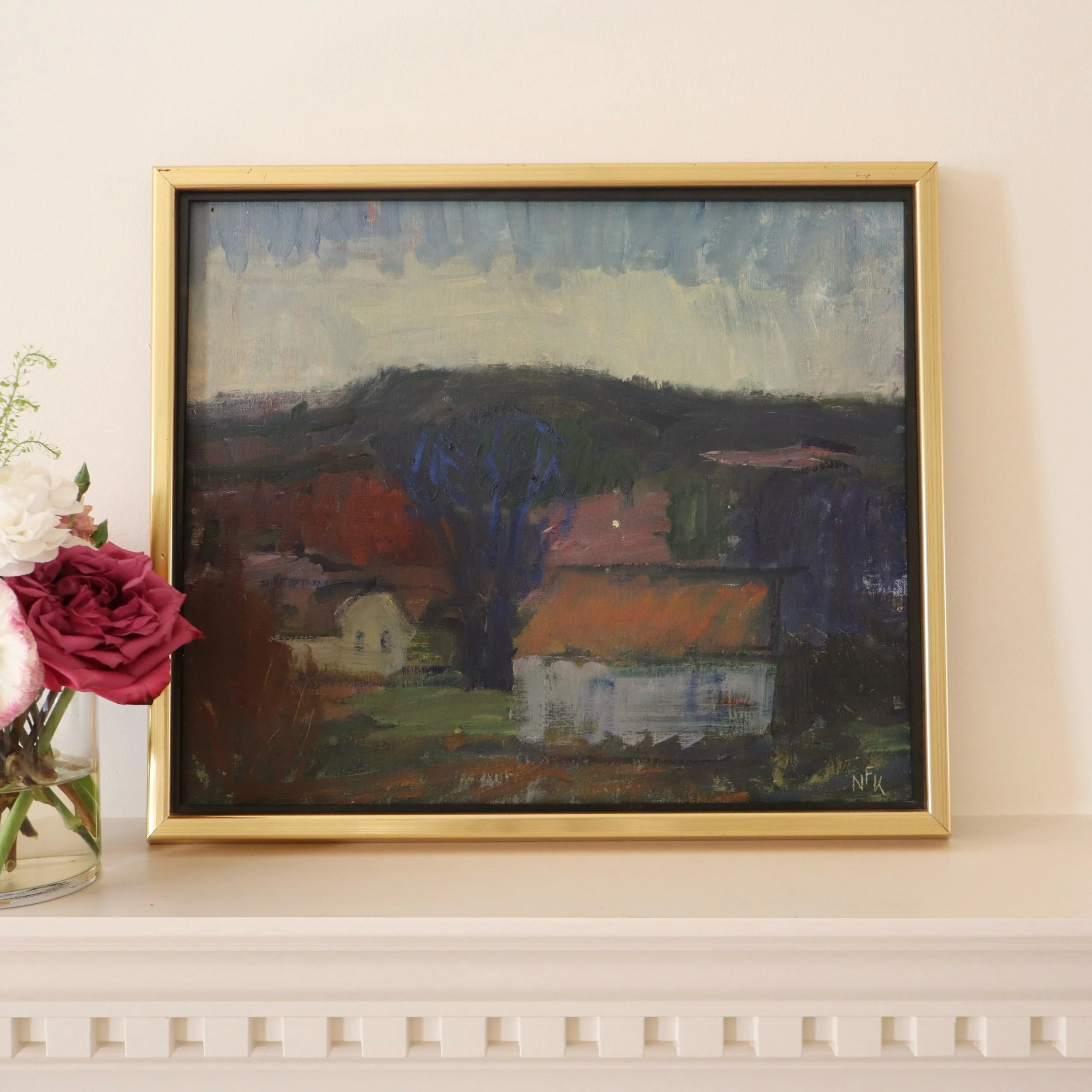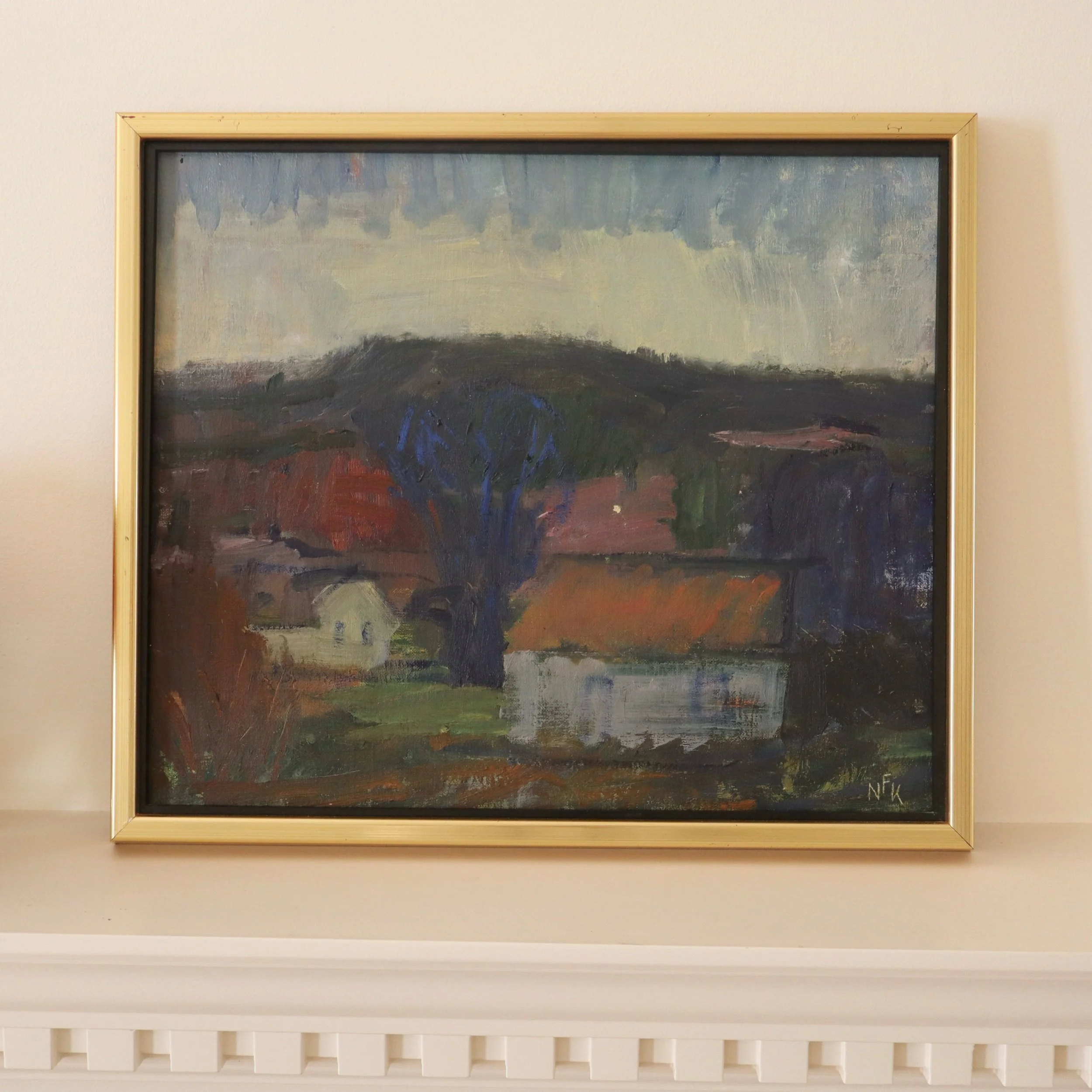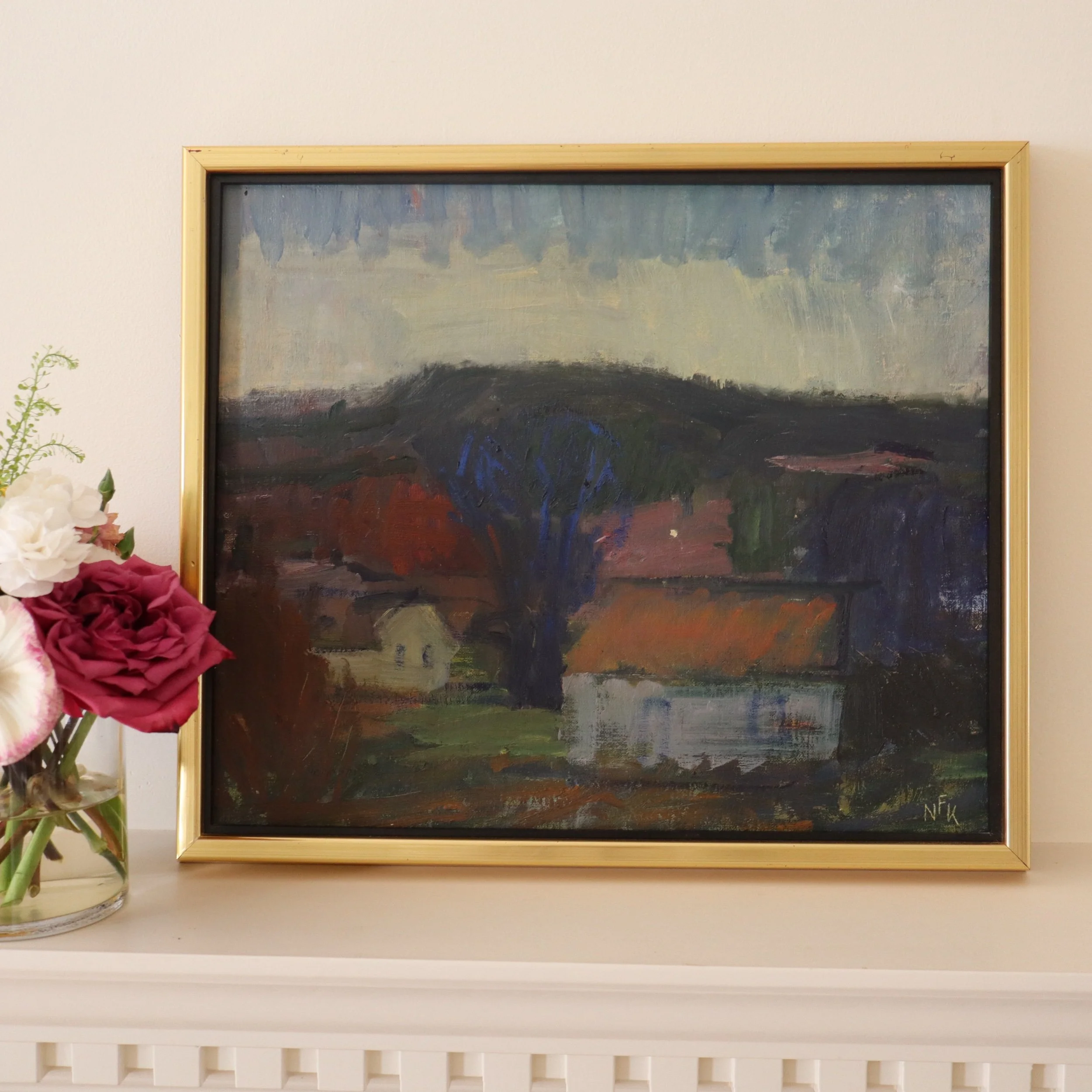 This oil painting by Swedish artist Nils Folke Knafve, titled Hillside Village, portrays a charming rural settlement with a vibrant, earthy allure. Measuring 18.5” x 15.5”, it features a cluster of houses nestled on a gentle slope, painted in warm browns and greens under a soft sky, with delicate brushwork enhancing the scene’s cozy atmosphere. Framed in a classic gold frame, it adds an inviting elegance to any space.