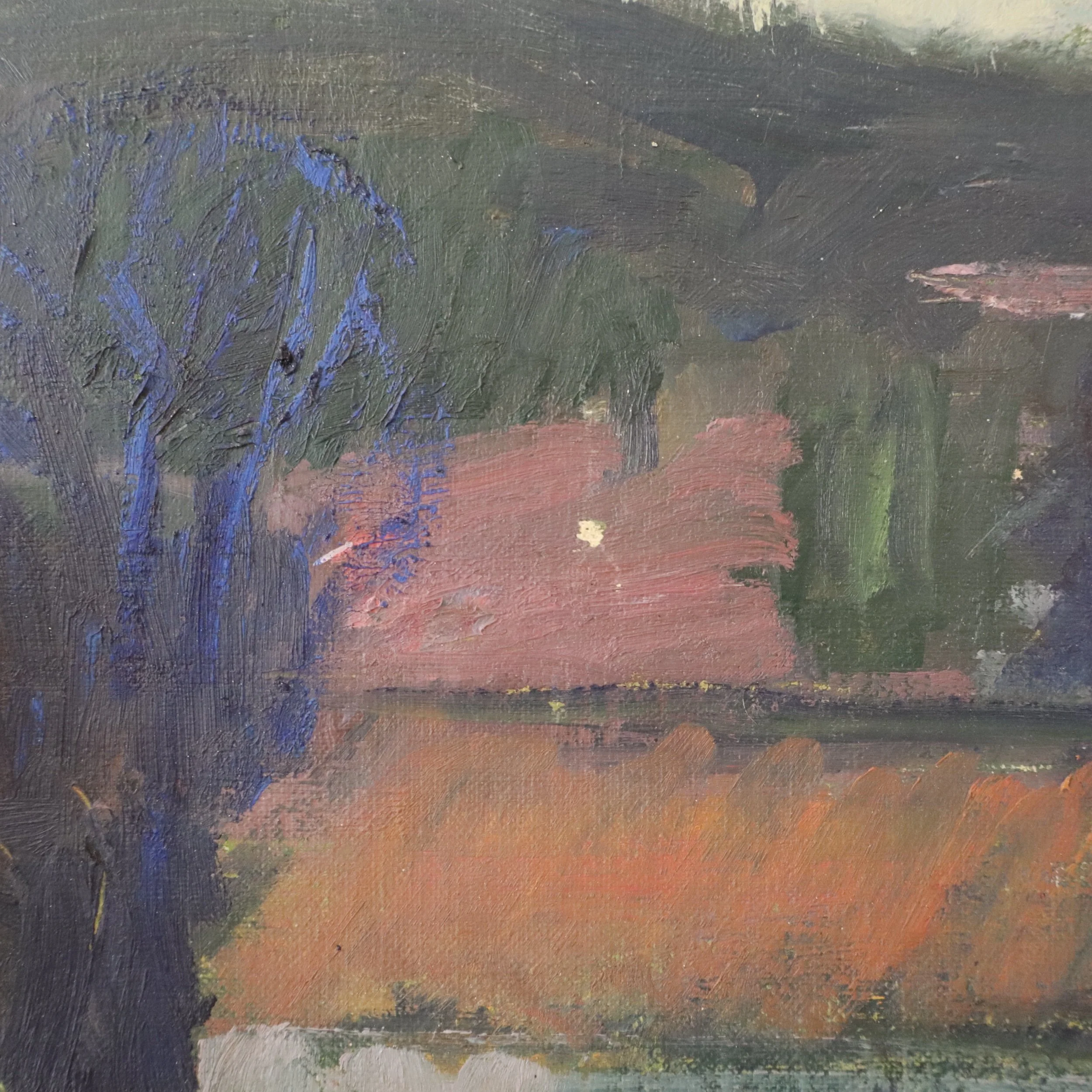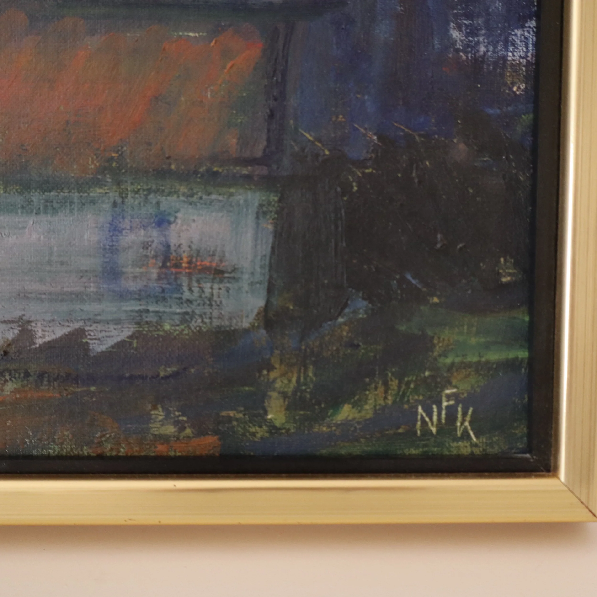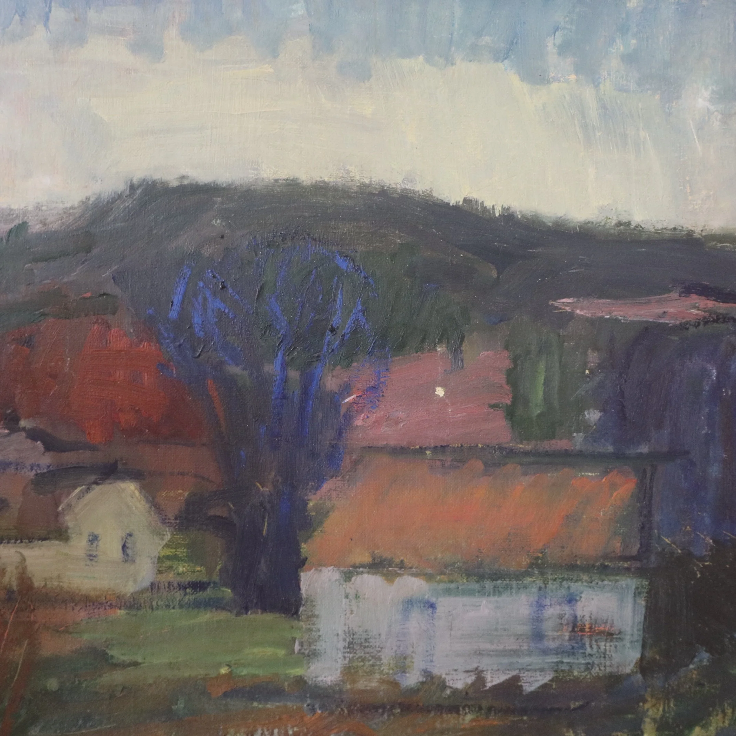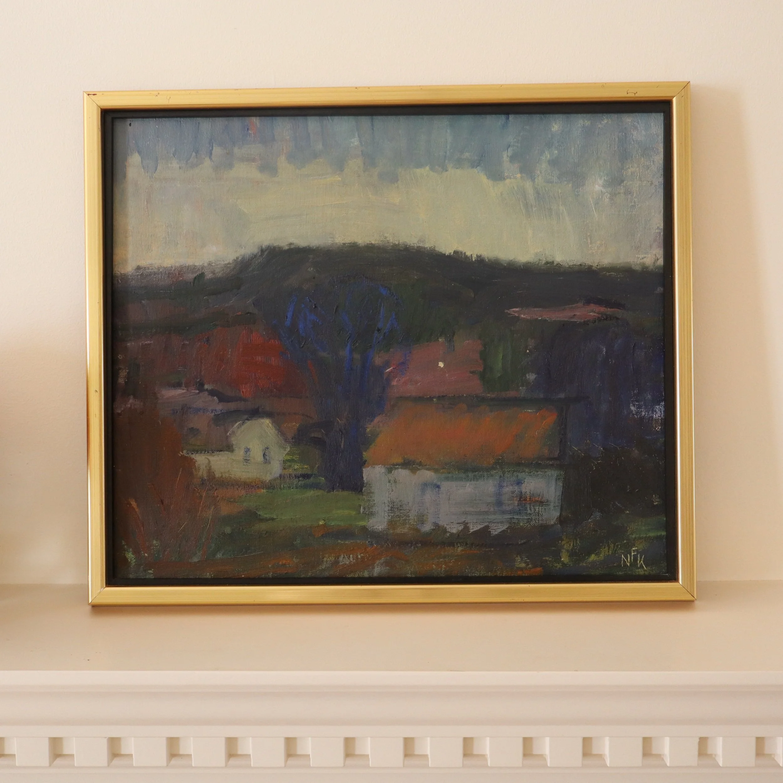 This oil painting by Swedish artist Nils Folke Knafve, titled Hillside Village, portrays a charming rural settlement with a vibrant, earthy allure. Measuring 18.5” x 15.5”, it features a cluster of houses nestled on a gentle slope, painted in warm browns and greens under a soft sky, with delicate brushwork enhancing the scene’s cozy atmosphere. Framed in a classic gold frame, it adds an inviting elegance to any space.