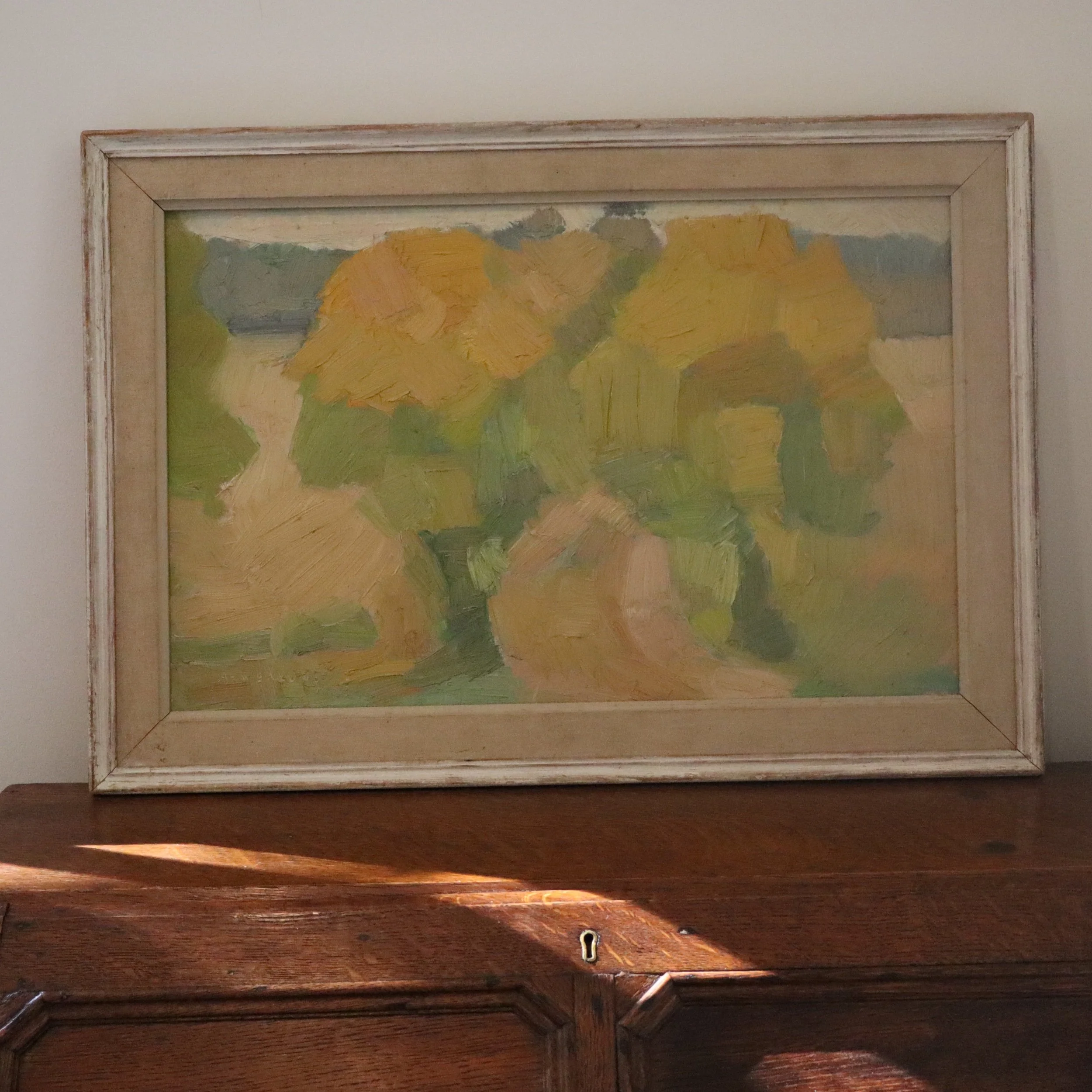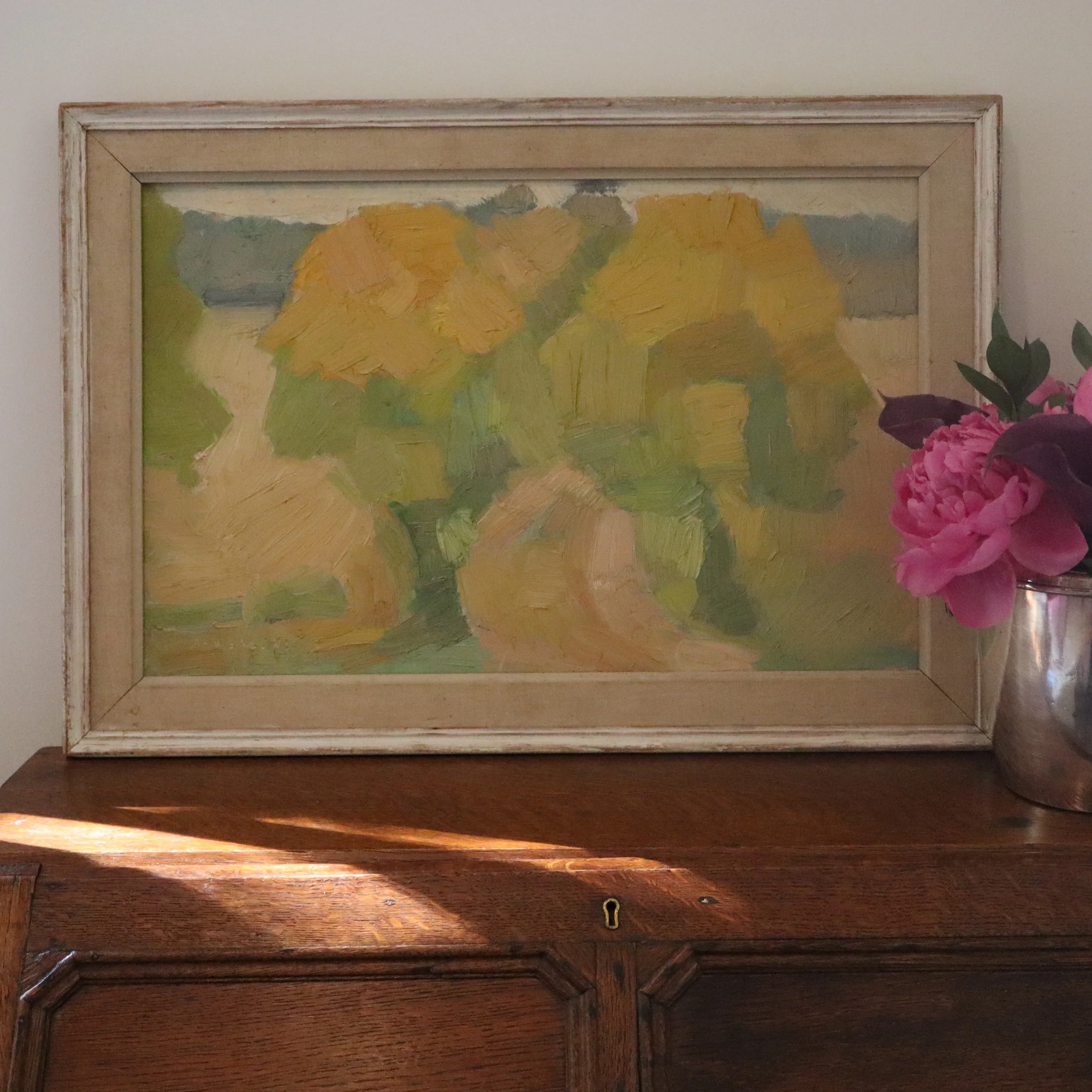 This oil painting by Swedish artist Ann-Marie Enlund, titled A Warm Afternoon, conveys a sunlit landscape with a radiant, inviting glow. Measuring 23.6” x 16.5”, it features trees painted in golden yellows and greens under a clear sky, painted with loose strokes that suggest gentle warmth and openness.