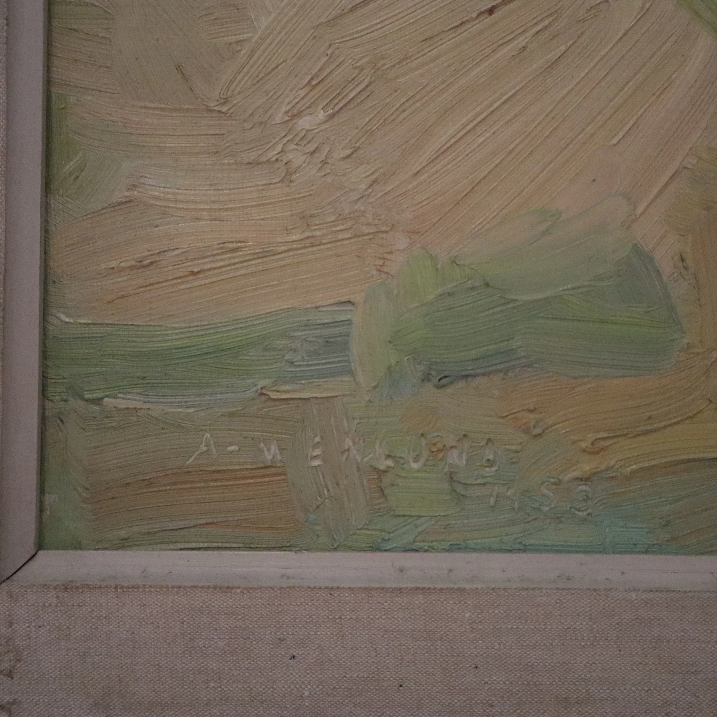 About the Artist: Ann-Marie Enlund (1925–2010) was a Swedish painter known for her landscapes and figurative works. Born in Degerfors, she studied at Konstfackskolan (1942–1947), Otte Skölds målarskola (1948), and the Royal Academy of Fine Arts in Stockholm (1949–1955). She traveled extensively to Tunisia, Morocco, Spain, France, Italy, and Holland, influencing her vibrant style. Exhibiting in Sweden and abroad, her pieces are held in collections like Värmlands museum and various public institutions.