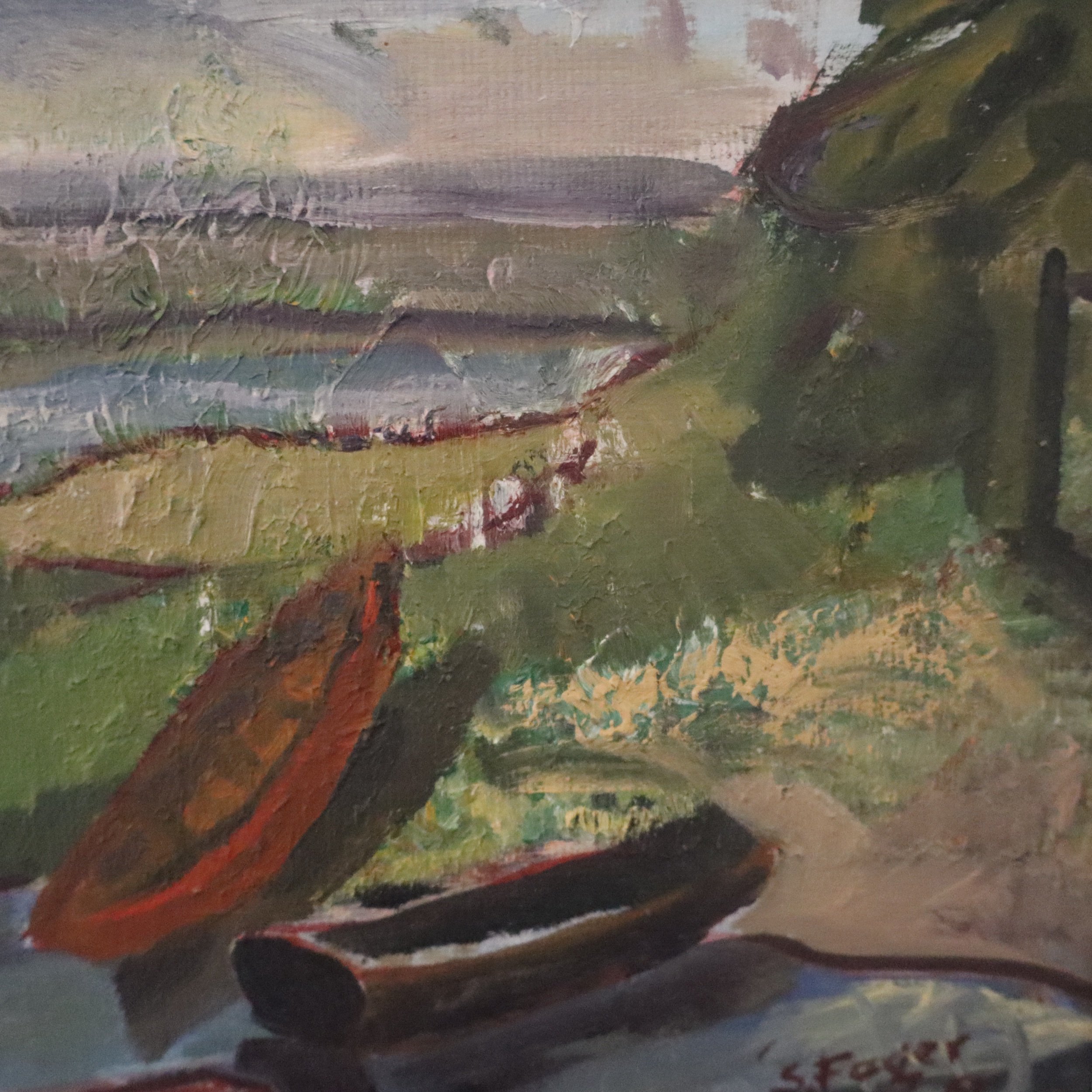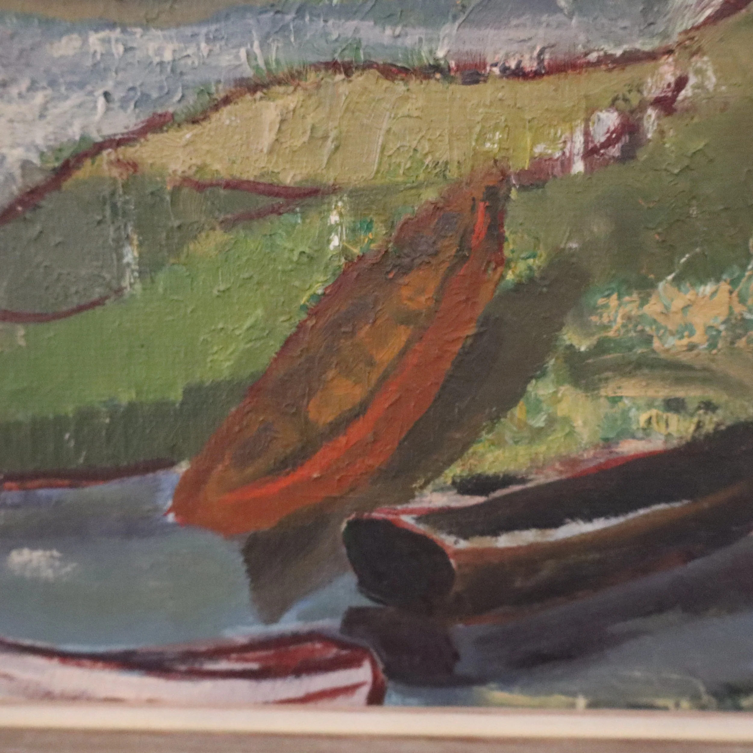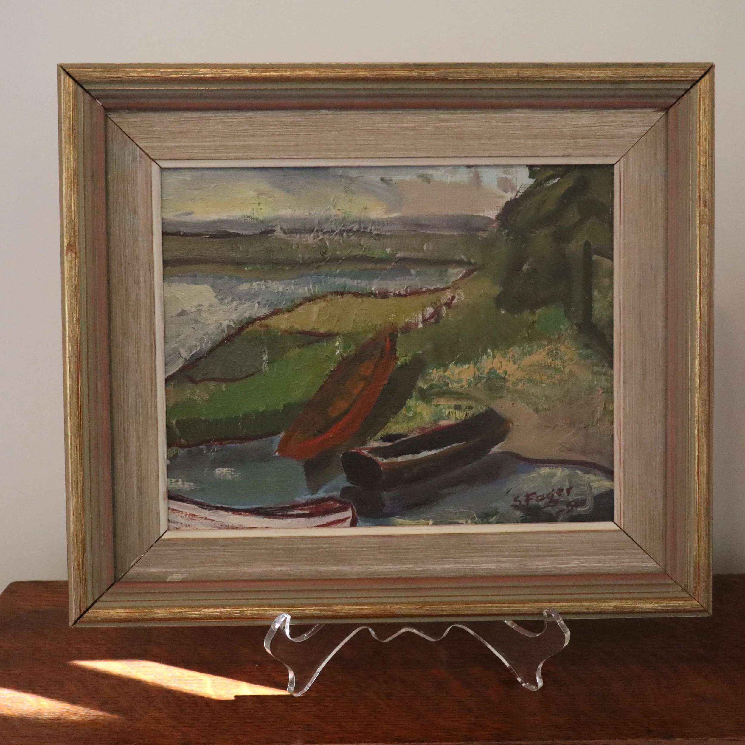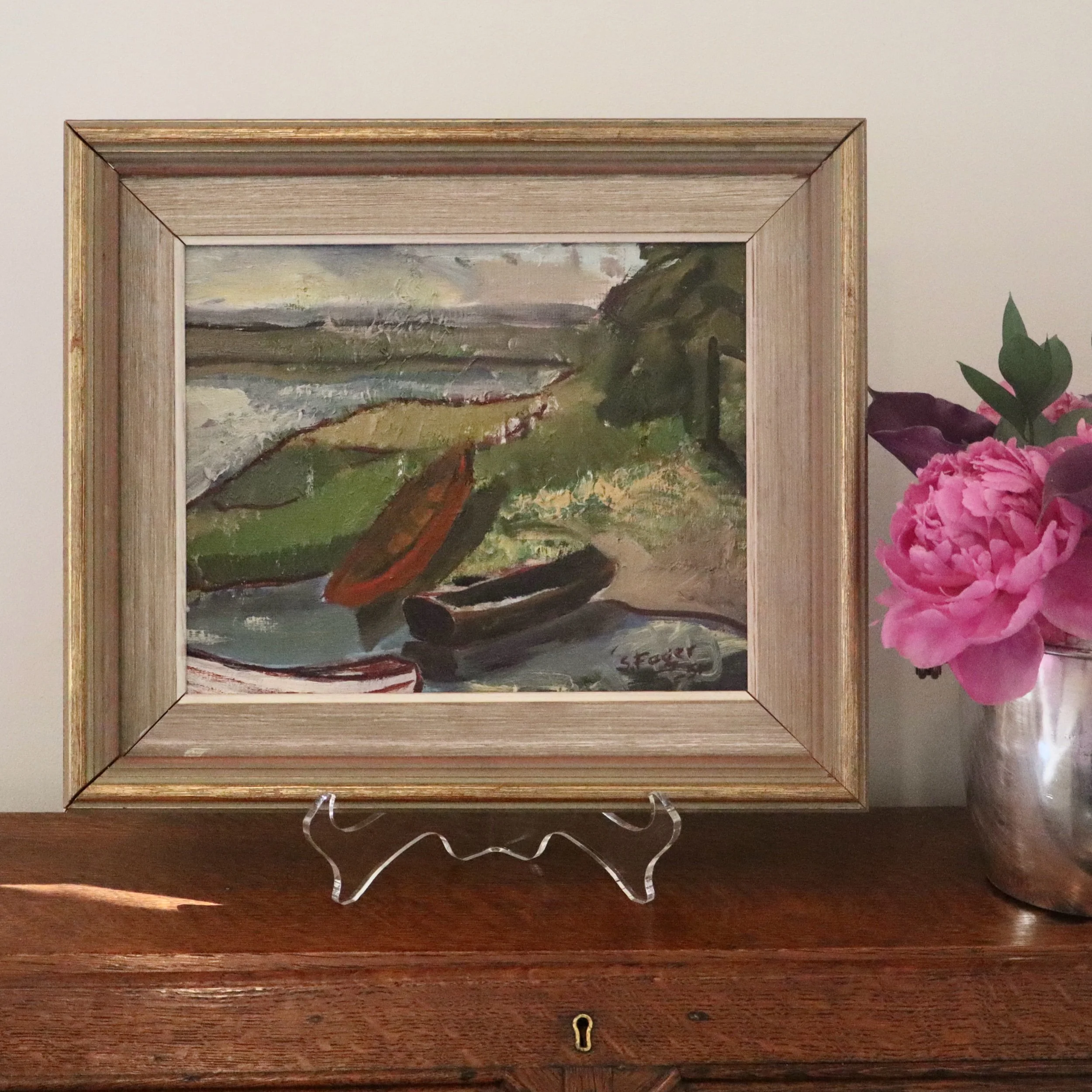 This oil painting by Swedish artist Sixten Fager captures a serene coastal scene with bold, expressive strokes. Measuring 13.5” x 15.5”, it features a striking red boat resting on a quiet shore amid lush greens and calm waters under a muted sky. The vibrant contrast and textured brushwork create a peaceful yet dynamic mood. Framed in a classic gold frame, it brings a touch of Nordic coastal beauty to any space.